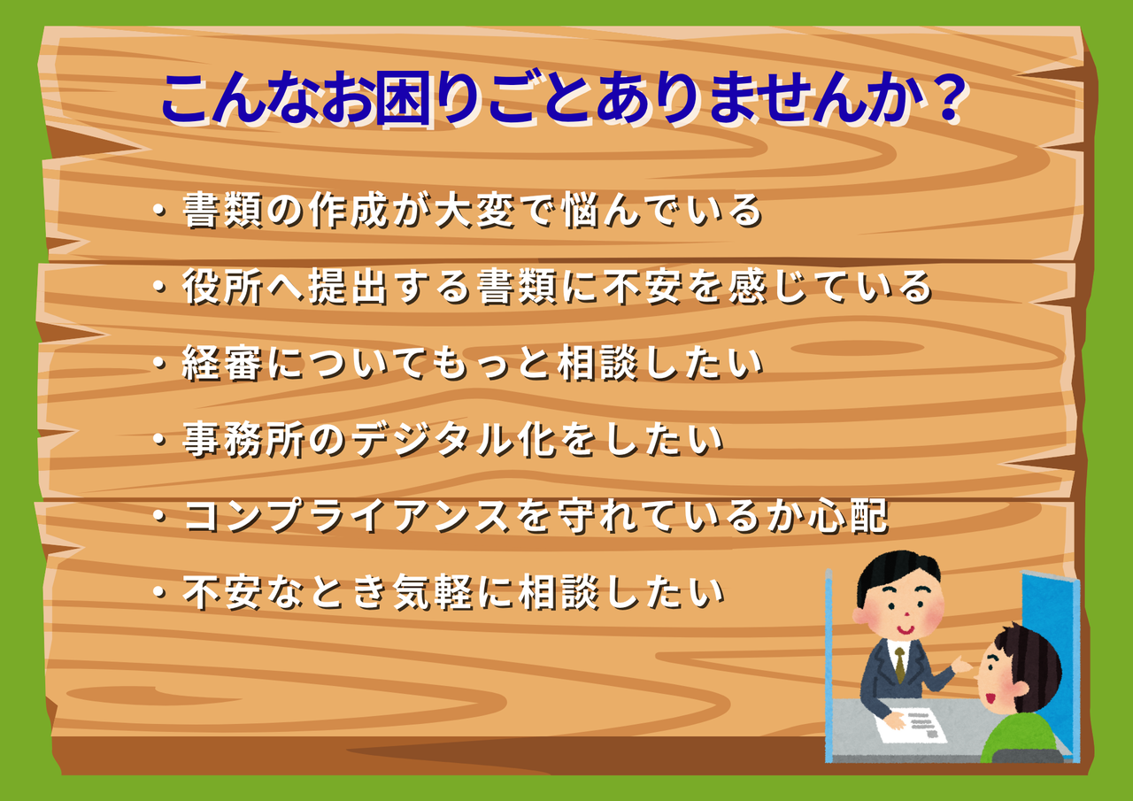 私たち行書士法人 欅は、今後の建設業の課題や技術職員の確保・育成・維持、また書類の保存やデータ化、社内環境の改善・整備等の「経営者の悩み」について一緒に解決して行けるよう知識と経験を基にお役に立ちます。